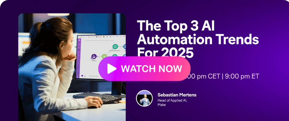 | Webinar: Discover AI automation trends in 2025 Stay ahead of the curve! Join Sebastian Mertens, Head of Applied AI at Make, as he reveals the top 3 AI automation trends for 2025. From emerging technologies to real-world applications, dive into what's next for automation and how to tackle it effectively. |
